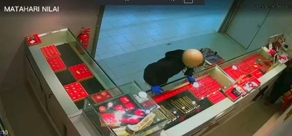 “汝来金店抢劫案”发生在芙蓉商圈的汝来新城阳光商场,引起周边商户和民众高度关注。闭路电视显示,两名蒙面匪徒动作迅速,短短约一分钟,就将约6万令吉的戒指、项链和手镯装入送货袋逃离。白色头盔男子先行进入金店,跨越柜台取出金饰,蓝色头盔同伙随后进入协助,手持疑似手枪监视店外情况,确保作案顺利。
